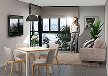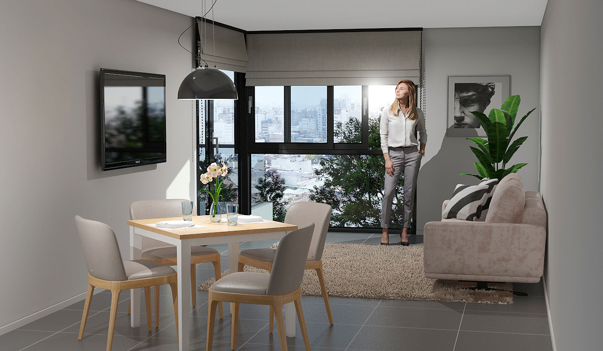 La obra está compuesta por departamentos de 1 y 2 dormitorios, 1 dormitorio Plus (con espacio extra), 1 duplex de 2 dormitorios en pisos 14 y 15, y cómodas cocheras.